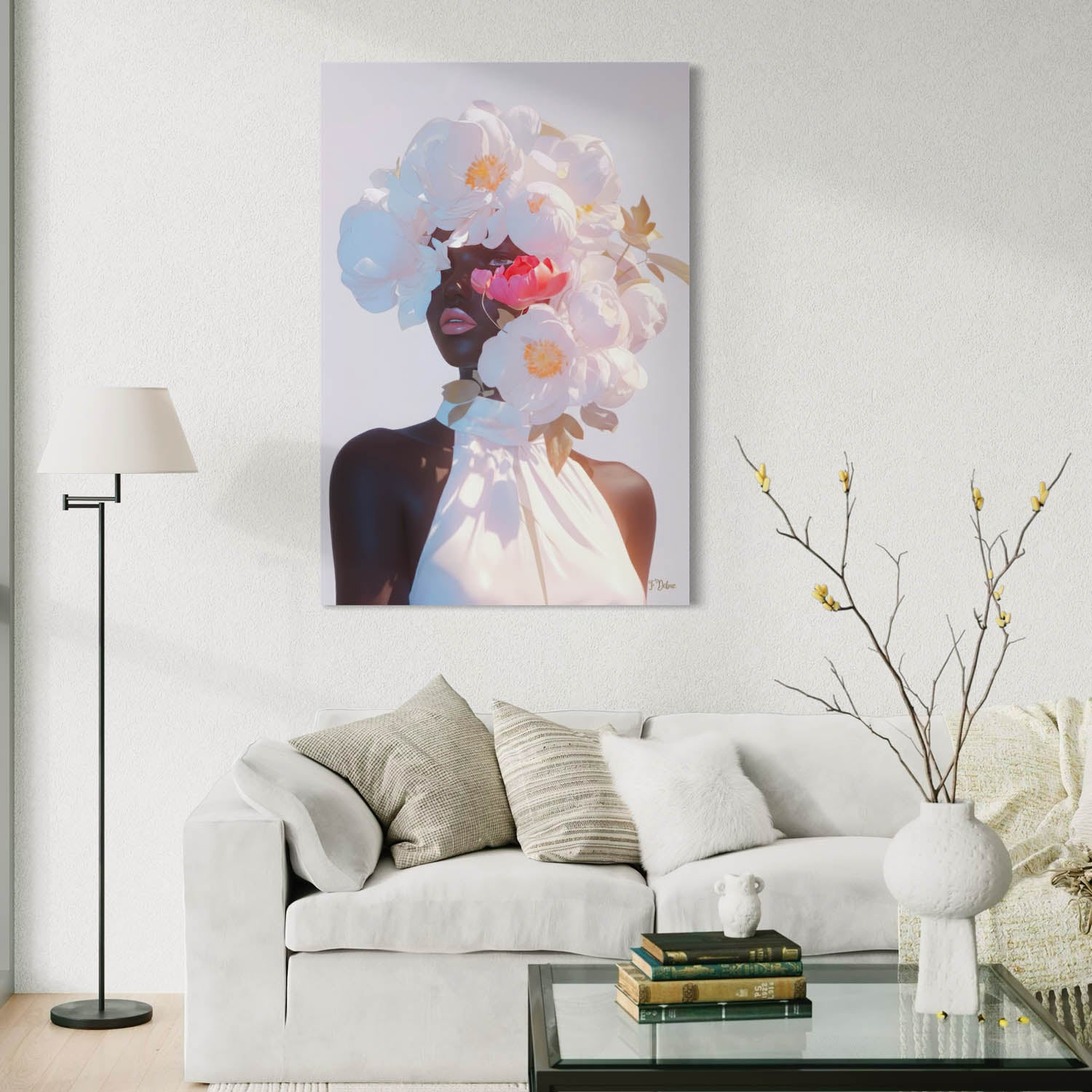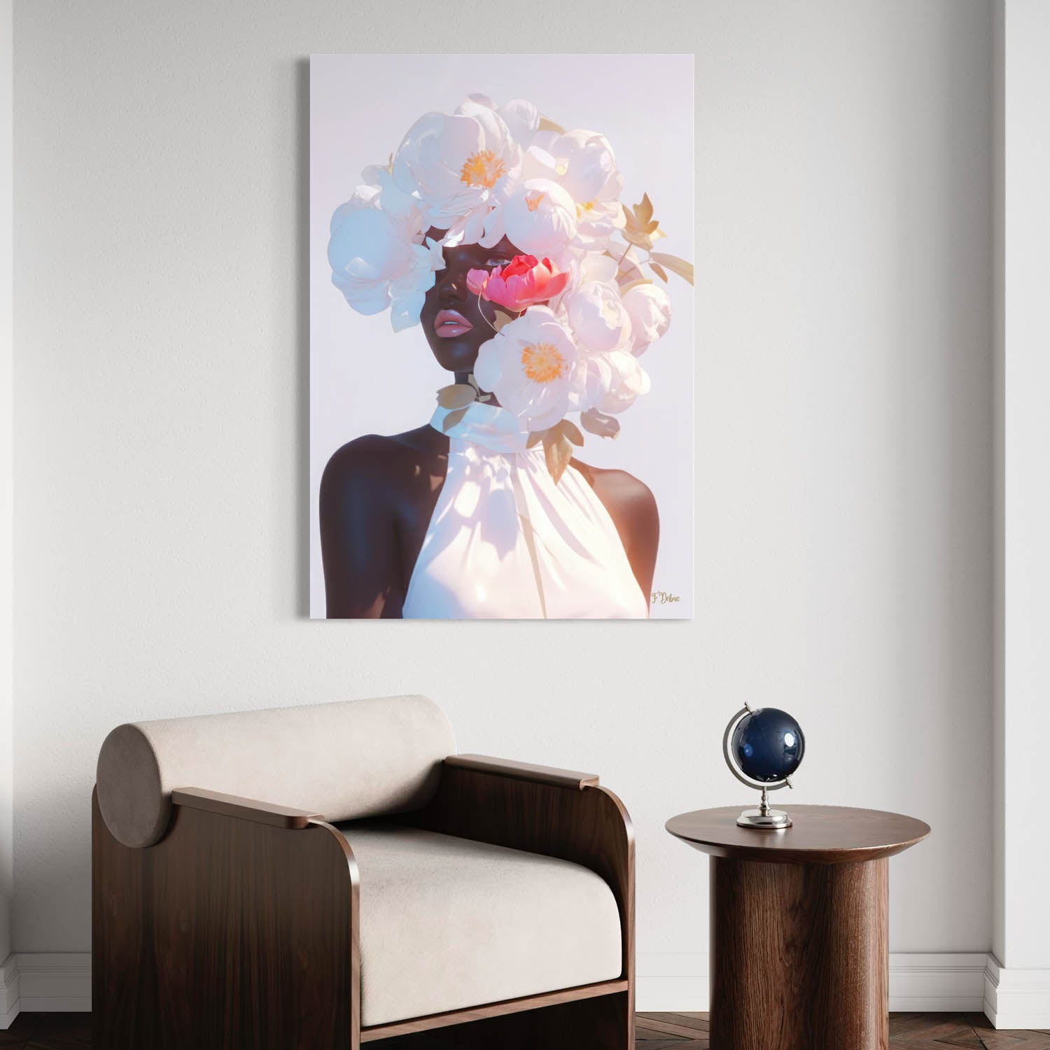 This unique artwork celebrates natural beauty. This expressive portrait features a black woman crowned with white flowers, symbolizing confidence, resilience, and joy. Ideal for modern living spaces.