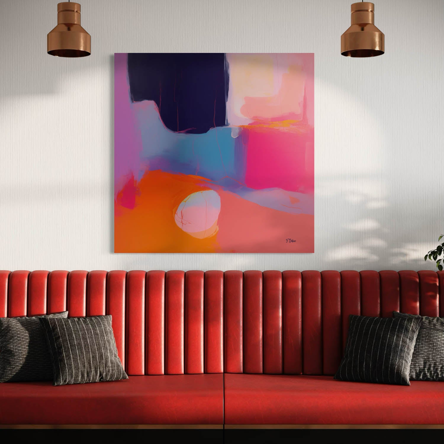 This painting combines blue, pink, and orange tones in a beautiful dance of light and depth. A perfect piece for tranquil modern homes.
