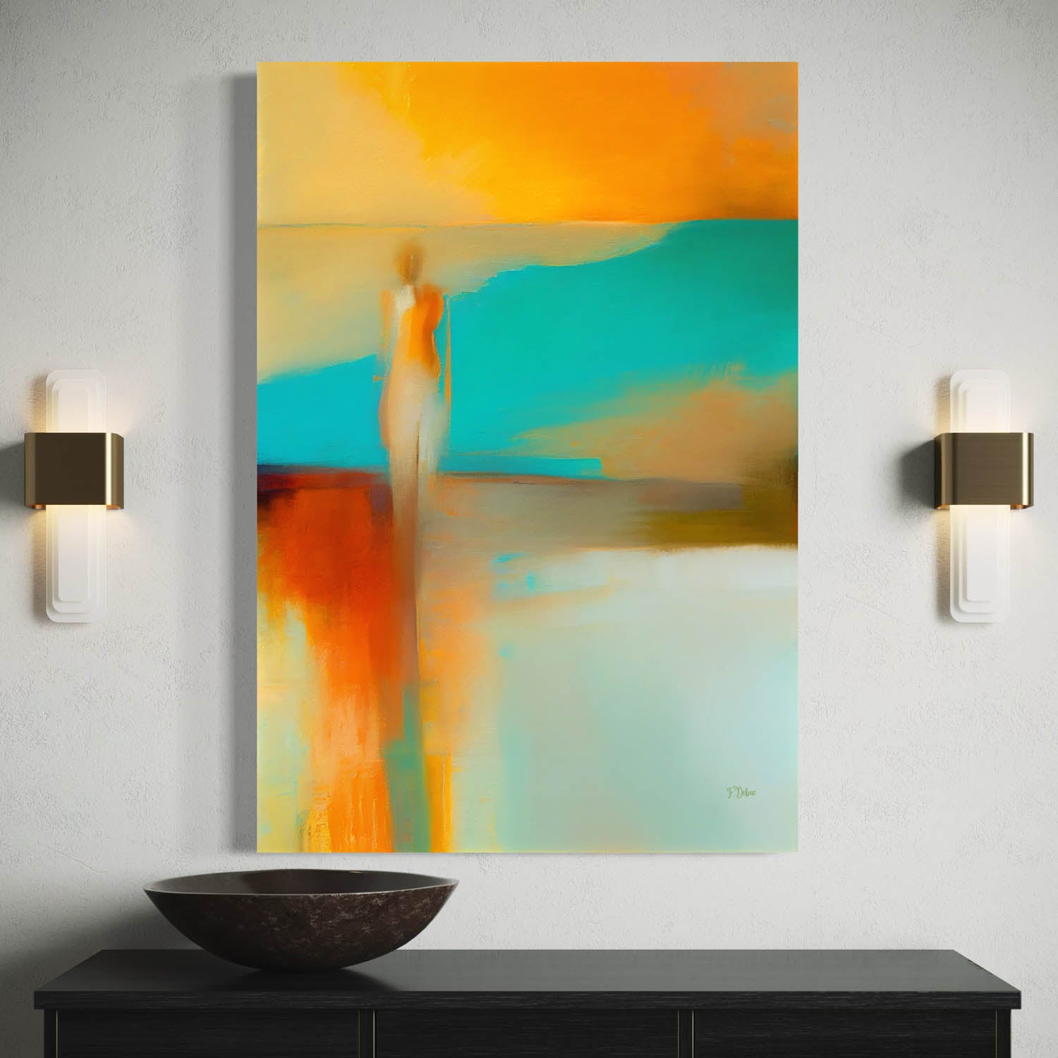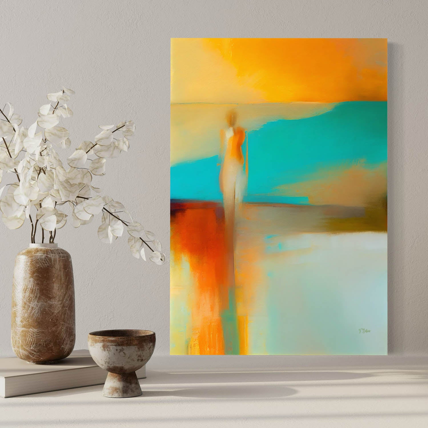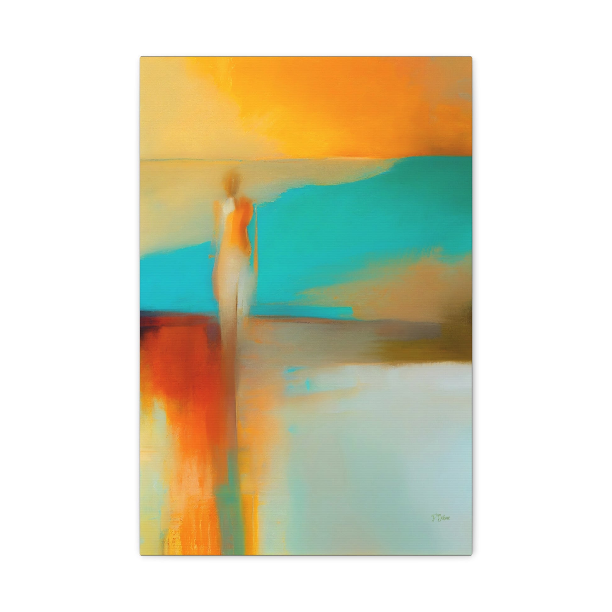 This artwork features an abstract human figure in a misty landscape of muted colors and subtle gradients. This is perfect for a modern home.