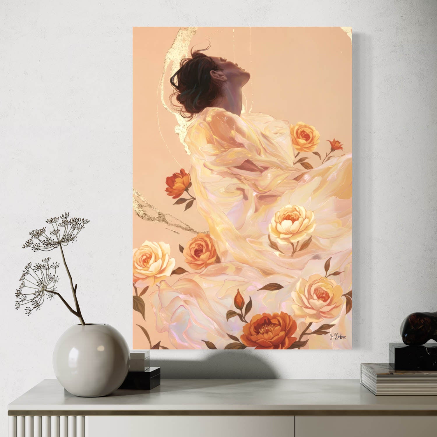 With dreamy layers of ivory and sand, this artwork embodies peace and refinement. The flowing dress with flowers and minimalist details invites a sense of openness and calm, ideal for modern homes.