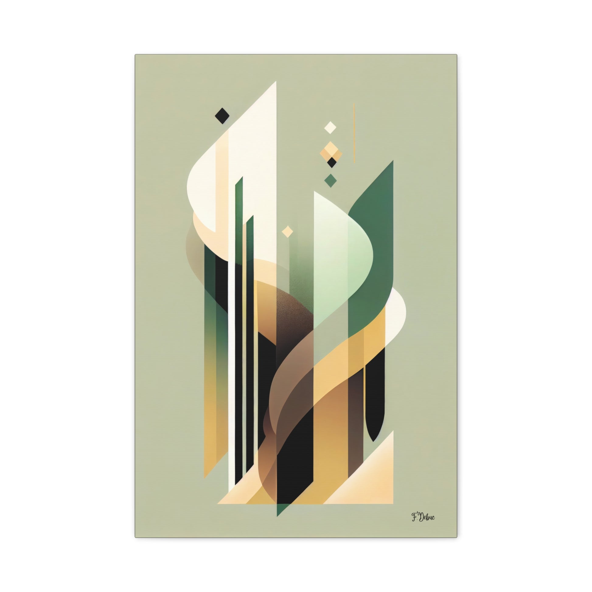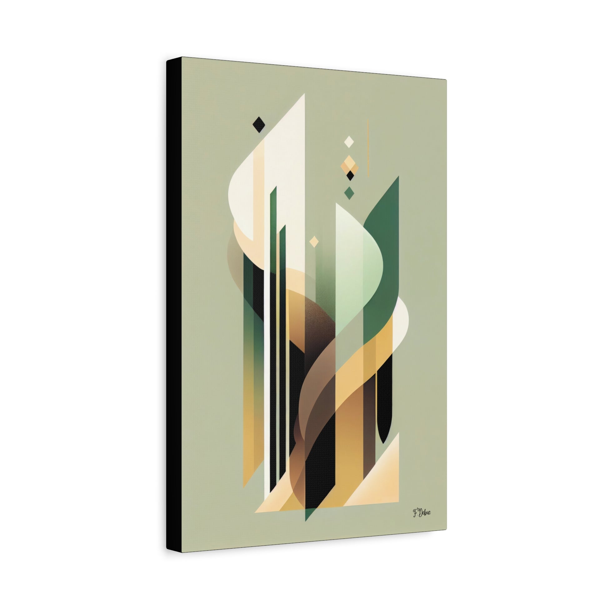 This painting is a flowing, dynamic composition of abstract forms and shapes, with a soothing green color palette. This unique artwork adds elegance to any room.