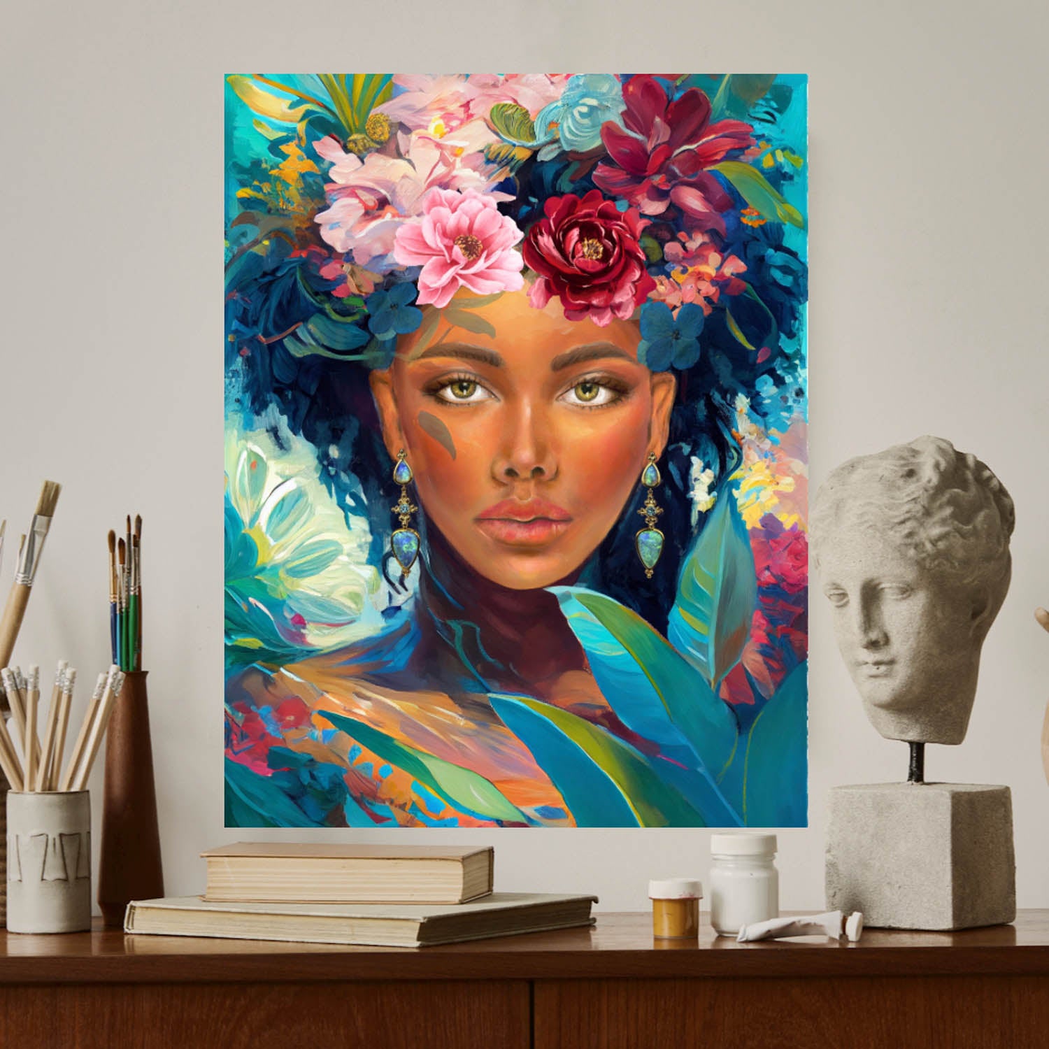 Our floral portrait painting features vibrant, detailed abstract flowers that add a pop of color and elegance to any space.