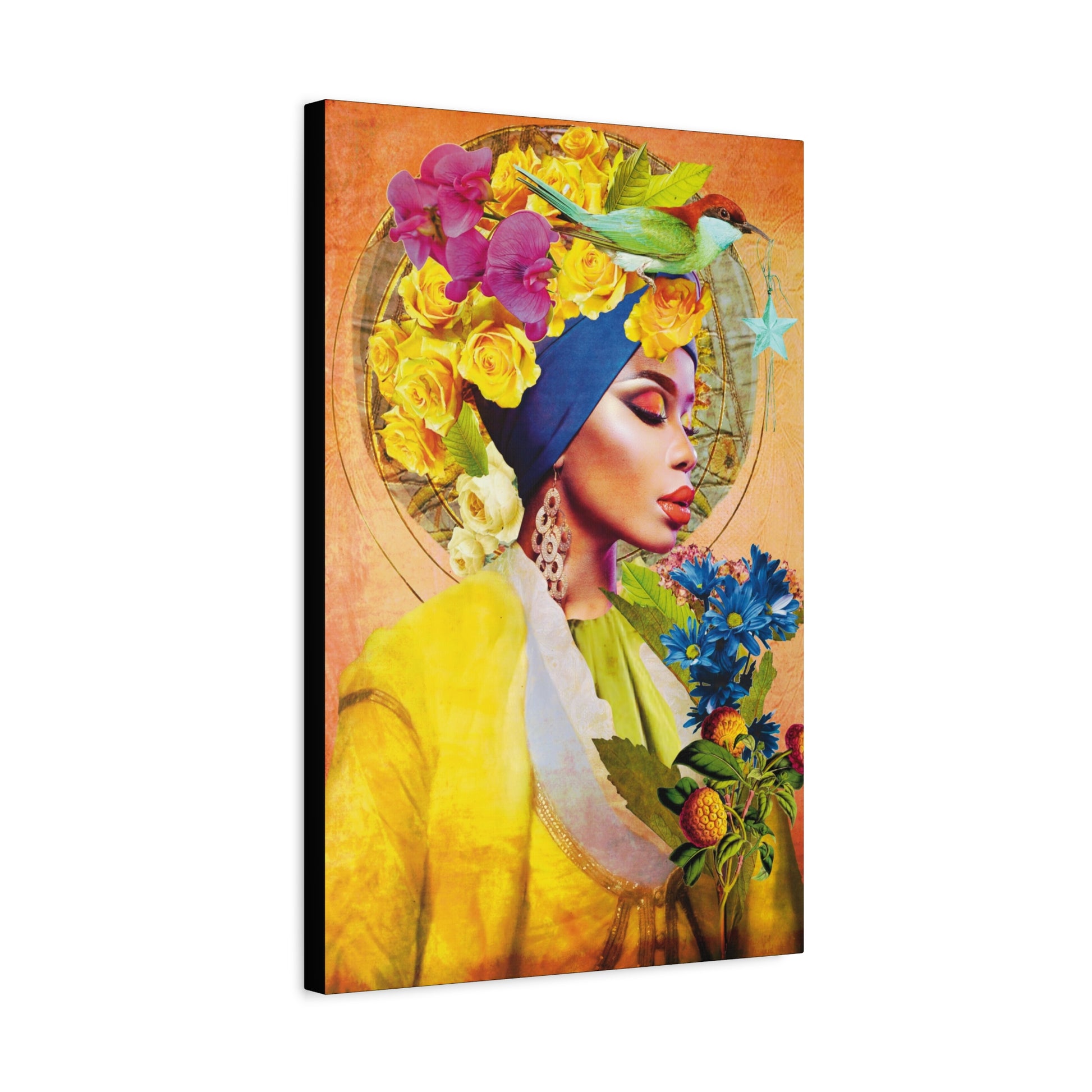 This beautifully illustrated portrait depicts an elegant woman in yellow tones.  The warm colors in the artwork will uplift any room’s décor and fit any home style.
